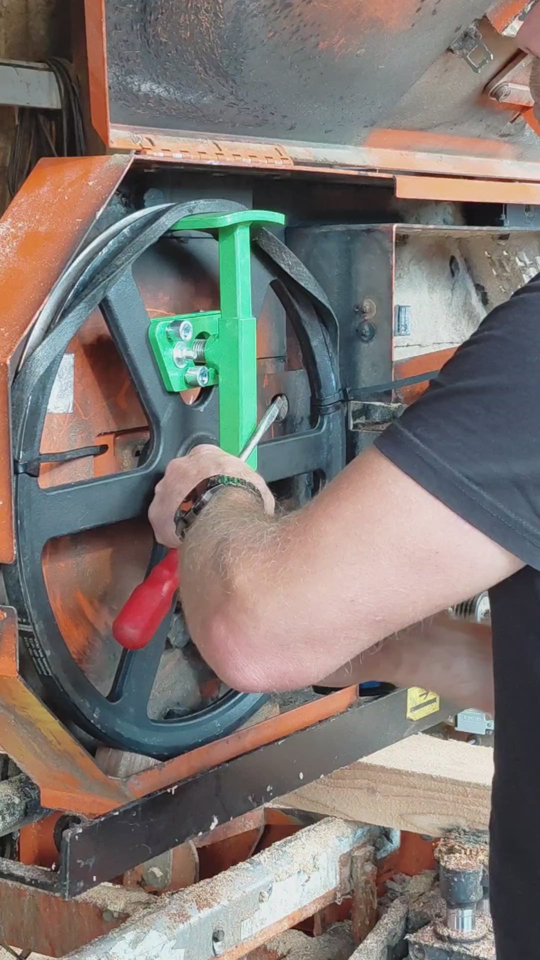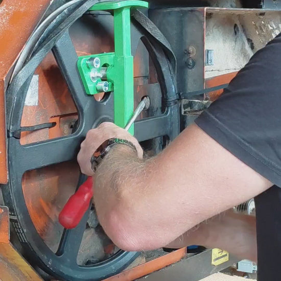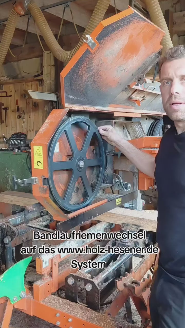 Notre outil de montage pour la mise en tension des courroies de volants a été spécialement conçu pour la scierie Wood-Mizer LT15. Il est parfaitement adapté à l’utilisation de courroies trapézoïdales ajustées, qui s’insèrent fermement et sans jeu dans la gorge des volants – contrairement aux courroies B57 montées d’origine, qui reposent souvent de manière lâche et sont maintenues en position par la lame.